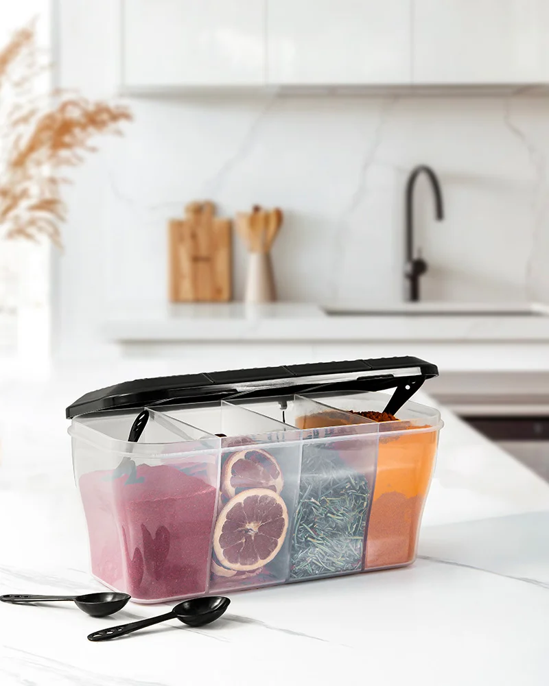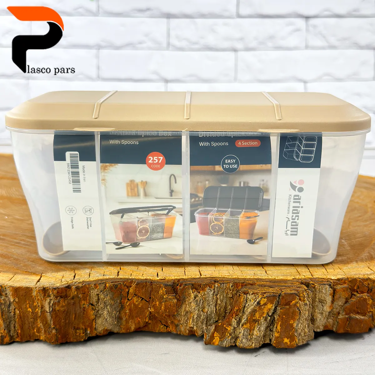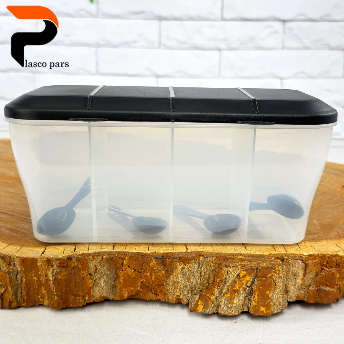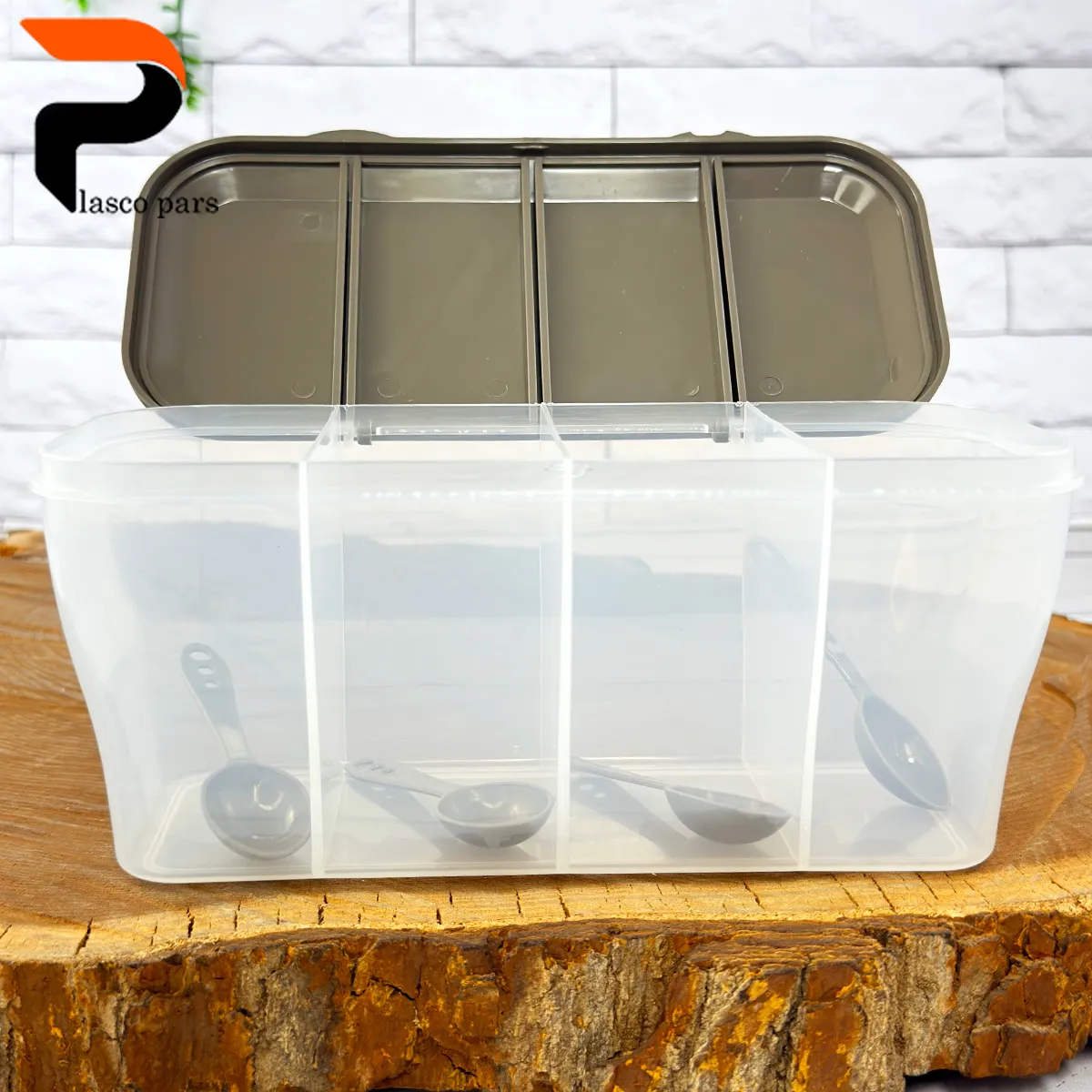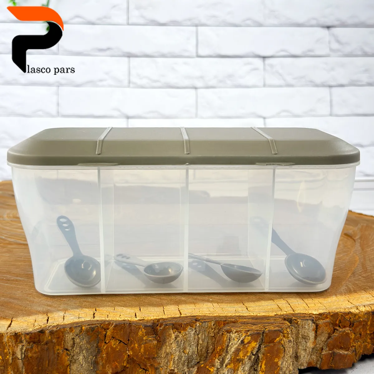 ظرف ادویه چهارخانه ، مناسب برای مسافرت و پیک نیک ، همراه با چهار عدد پیمانه