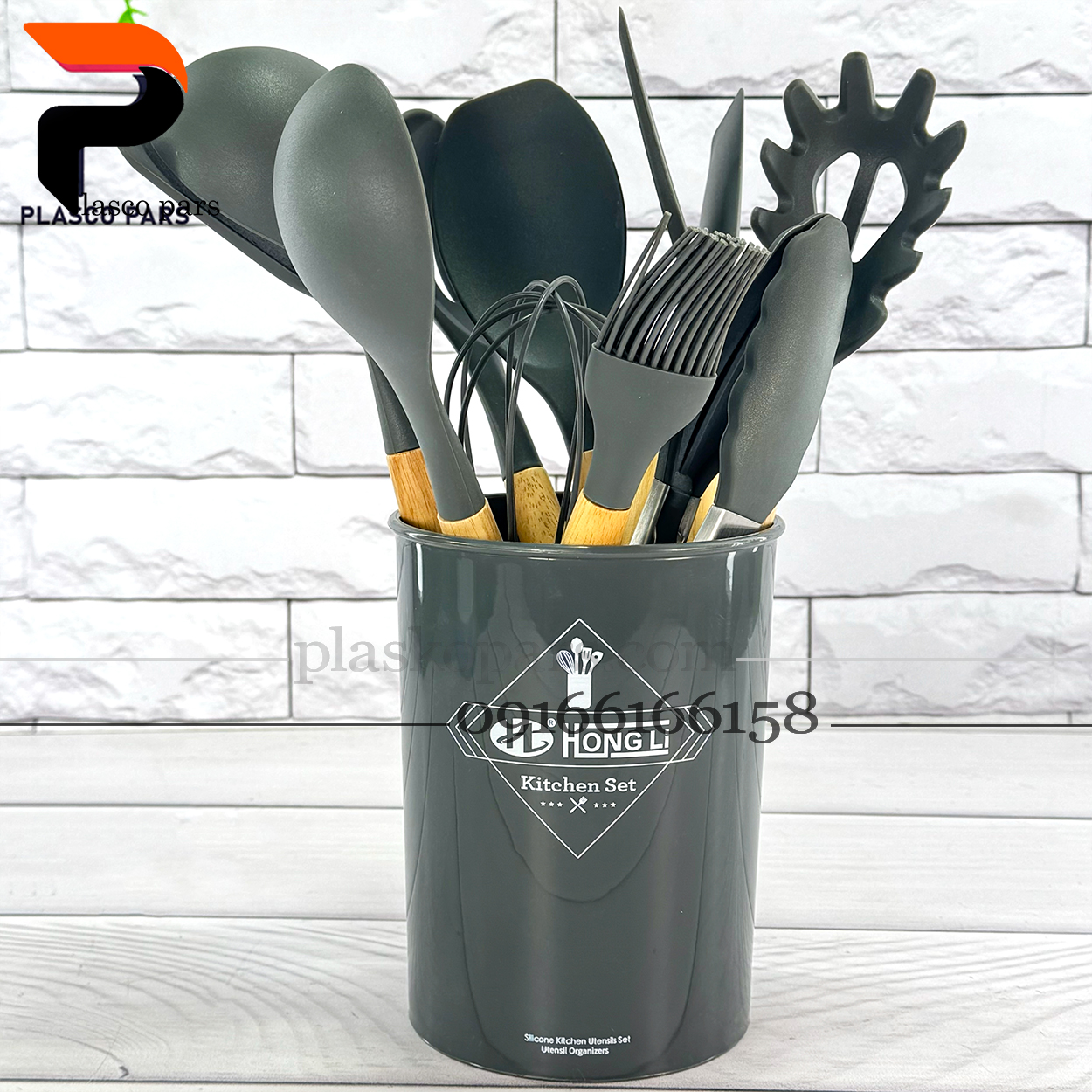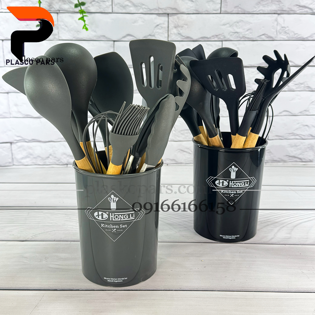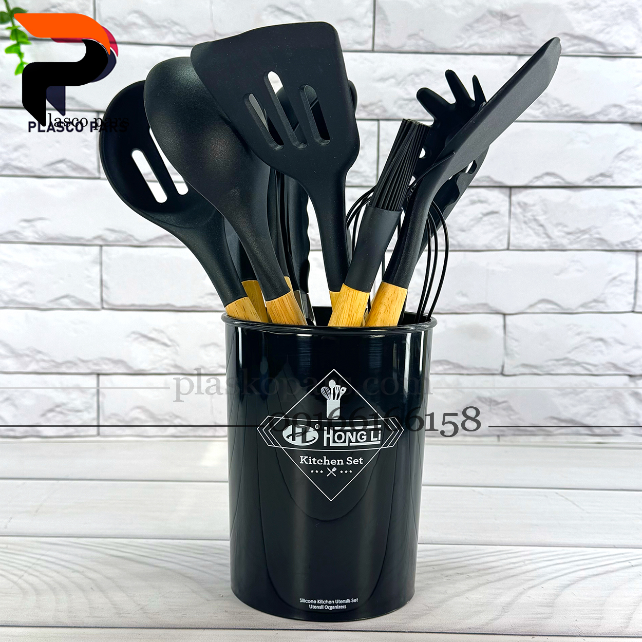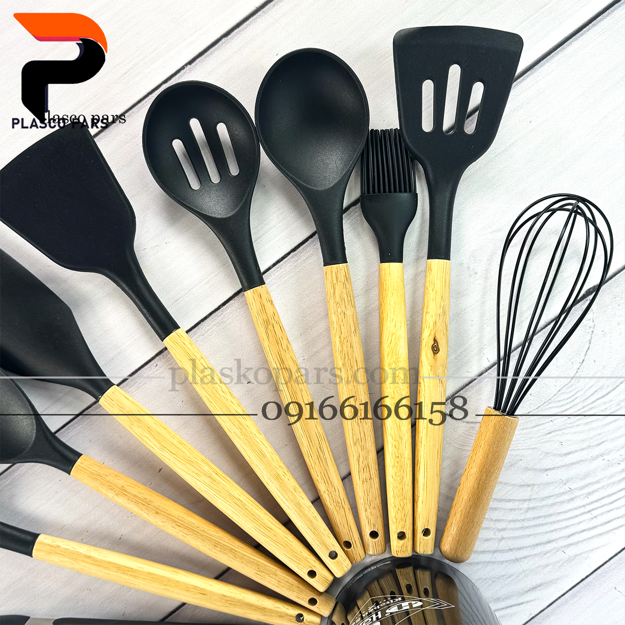 ست کفگیر ملاقه سیلیکونی دسته چوب 12 پارچه
