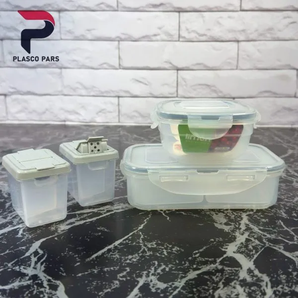 شامل 1عدد باکس دسته دار + 8عدد پلوخوری + 8عدد خورشت خوری + 8عدد پیش دستی + 8عدد پیاله + 1عدد دیس + 3عدد سبد نون سبزی + 1عدد کفگیر و ملاقه + 1عدد جاکاردی + 8عدد قاشق و چنگال و کارد + 1عدد ظرف نگهدارنده مستطیل + 1عدد ظرف نگهدارنده مربع + 2عدد نمک پاش + 1عدد رنده مخزن دار + 1عدد بطری آبلیمو